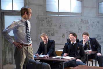 In Janet Bird’s stage design, slow rotations of the central stage piece at appropriate points in the action underscores the revolution of time that is the topic of the boys’ lessons. The illustrious graph paper of every schoolchild’s youth – pale green lines in repetitive squares – figures as the witty base for effective, swift-changing backdrops. Notably, the filmed projections used at the National have been dispensed with entirely, resulting in some snappily paced action.